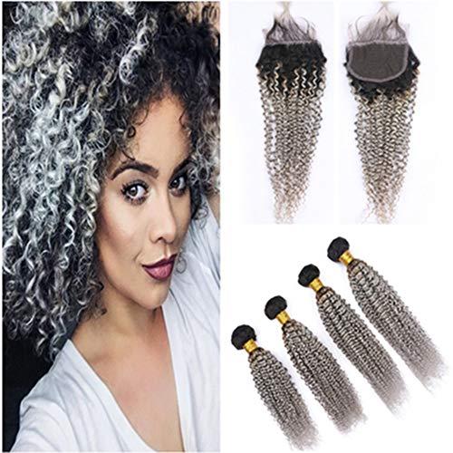 - 2)Texture:Kinky Curly Silver Grey Ombre Human Hair 4 Bundles and Lace Closure