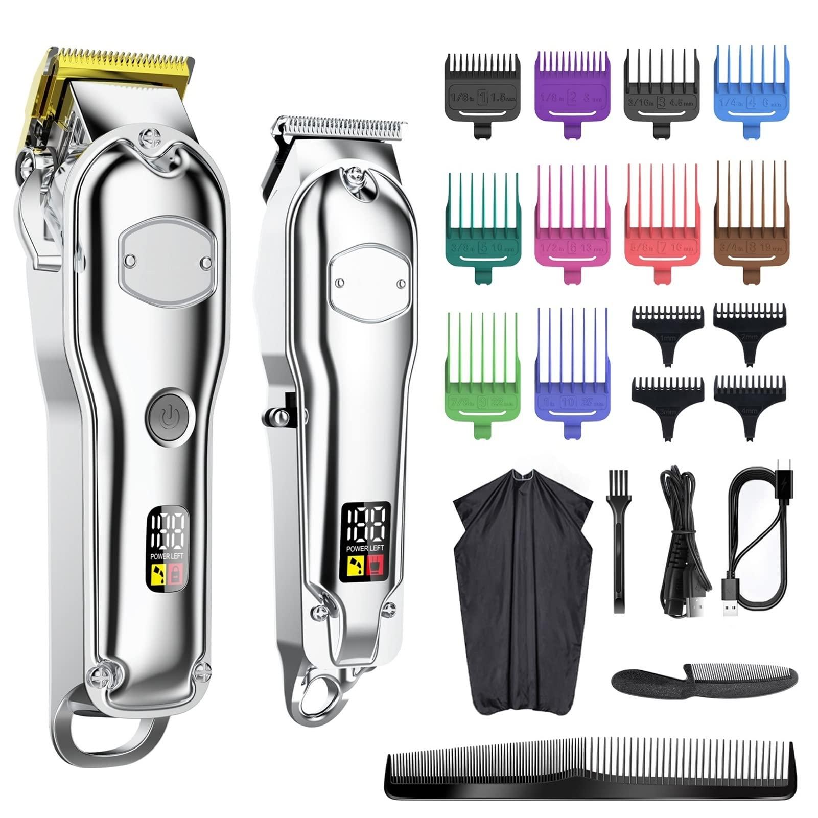 Specification:Body material: Metal+LCD screenBlade material: stainless steelbladeCharging time: 3 hours(Big machine) 2.5 hours(Small machine)Using time: 300 minutes(Big machine) 180minutes(Small machine)Package Content:2 x Hair clipper14 x Limit combs(1.5mm/3mm/4.5mm/6mm/10mm/13mm/16mm/19mm/22mm/25mm, 1mm/2mm/3mm/4mm)1 x Cleaning brush2 x USB2 x combs1 x Hairdressing cloak1 x User manual(Multiple language)