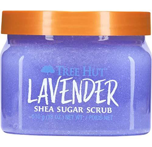 Tree Hut Lavender Shea Sugar Scrub, Size 18 oz. Experience an intense exfoliation and reveal glowing skin with Tree Hut Shea Sugar Body Scrub in the mood-soothing scent of Lavender. Made with Sugar, Shea Butter, Vanilla, and an array of natural oils including Lavender, Evening Primrose, Avocado, Macadamia, Sweet Almond, Safflower, and Orange Oils. Paraben-free, vegan, sulfate-free, alcohol-free, contains no formaldehyde donors, has a no-slip formula, and long-lasting fragrance. Features a 6-oil blend of Avocado Oil, Macadamia Oil, Sweet Orange Oil, Sweet Almond Oil, Evening Primrose Oil, and Safflower Oil.