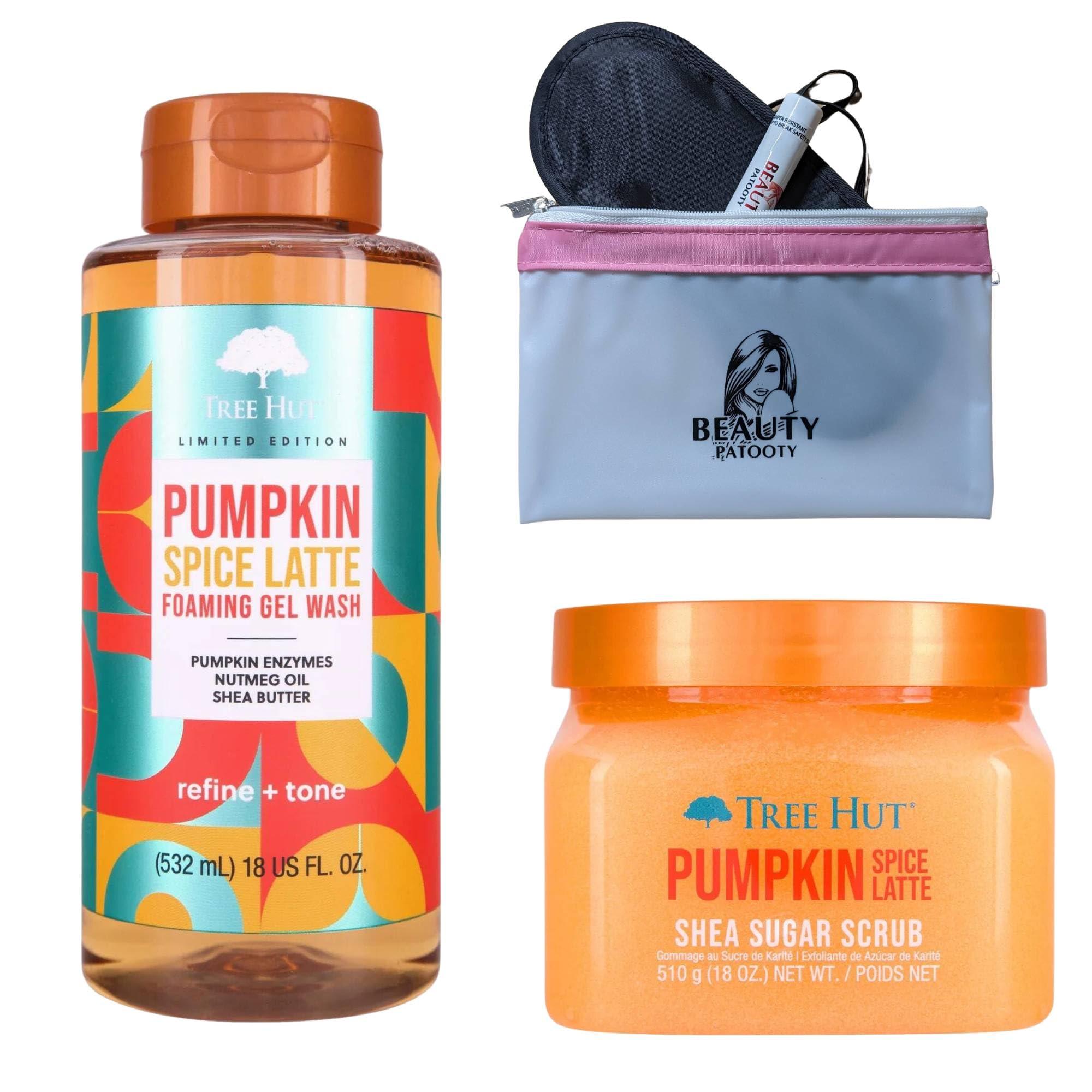 - CONVENIENT SET: This practical set includes both Pumpkin Spice Latte Shea Body Scrub AND Pumpkin Spice Latte Foaming Gel Body Wash, bundled with a Beauty Patooty self-care kit - a makeup bag, a lip balm, and a sleep mask.