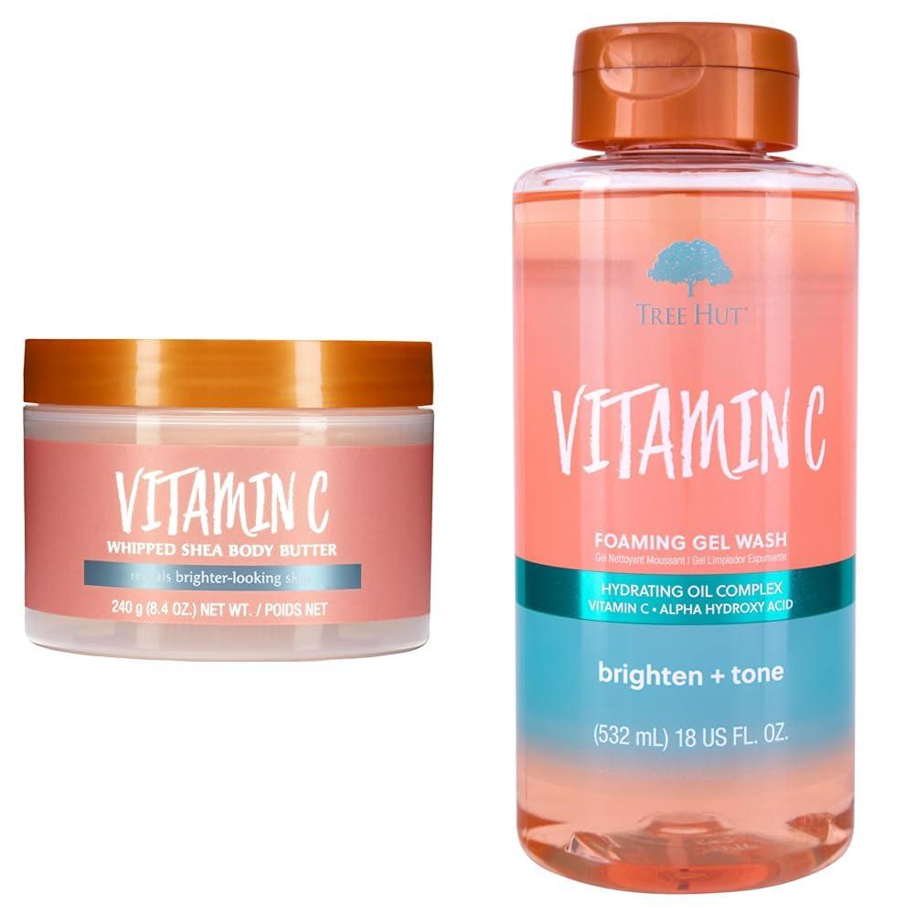 The Tree Hut Vitamin C skincare bundle pairs an 8.4oz tub of lightweight, whipped body butter with an 18oz bottle of nourishing foaming body wash. The body butter features a creamy, non-greasy formula infused with skin-brightening vitamin C and exfoliating alpha hydroxy acid. It absorbs quickly to provide long-lasting hydration, leaving skin feeling soft and smooth. The foaming body wash also contains vitamin C and alpha hydroxy acid to cleanse and soften without stripping moisture. Its hydrating oil complex with shea butter and citrus oils leaves skin fresh and glowing. Both products share an energizing pink grapefruit, jasmine and peach nectar fragrance. Used together, they offer a complementary skincare routine to reveal brighter, softer, more even-toned skin.