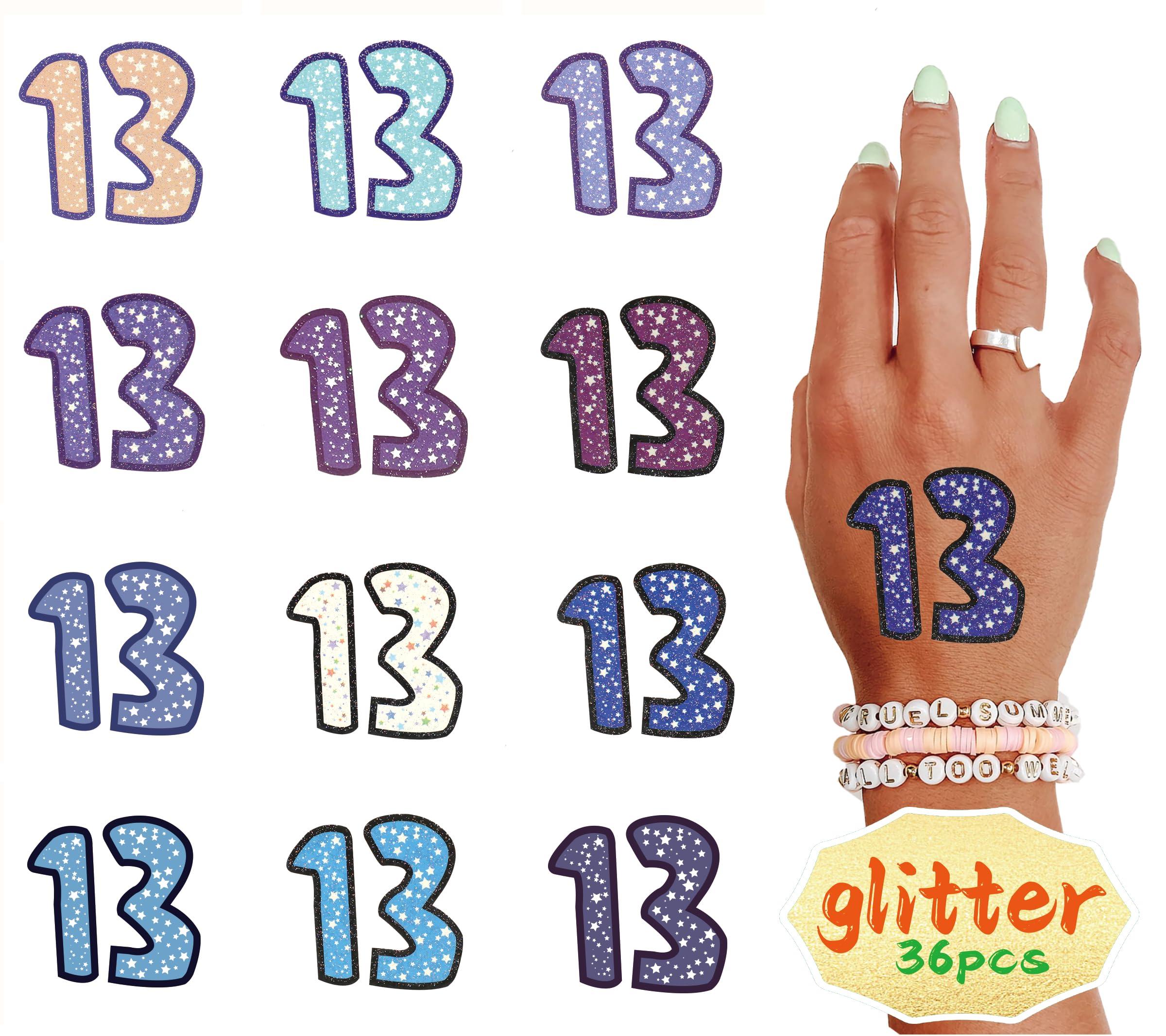 - There are 36 pieces of 13 temporary tattoo which Include 12 types of 13 glitter tattoo in total.Unlike the basic model, this one will have a shimmering dreamy effect under the right light.