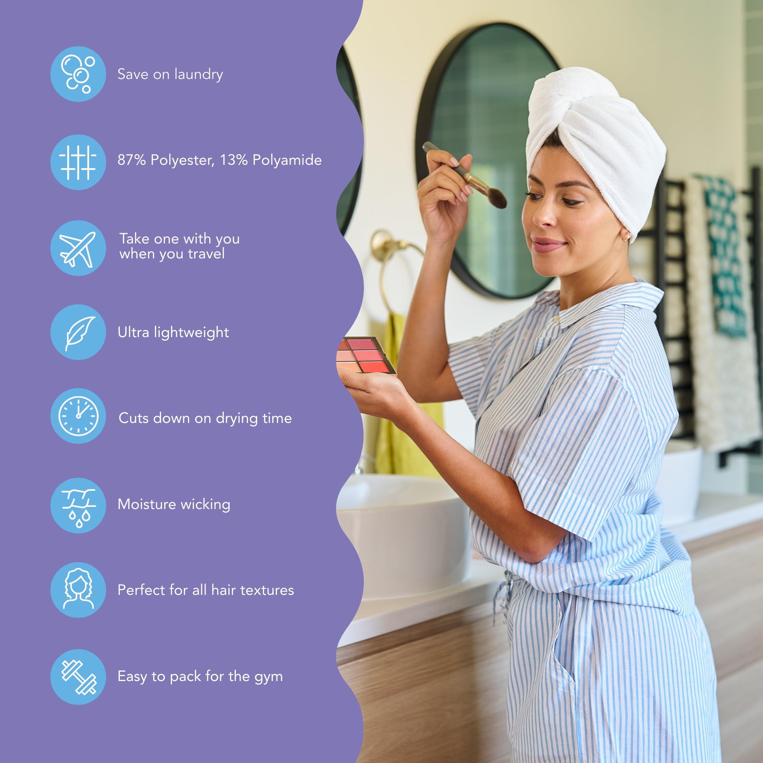 • Super Absorbent Head Towel: Our microfiber hair towel soaks up water, while not drying your hair completely, cutting down on drying time and reducing blow drying