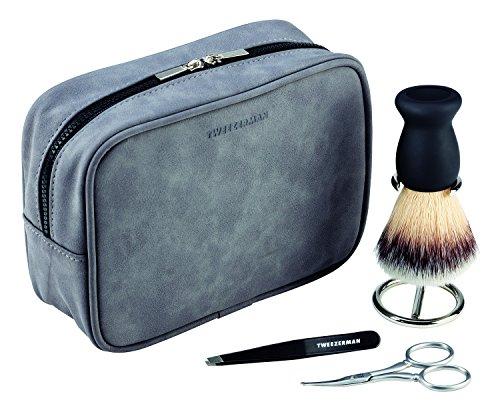 Tweezerman Gear facial grooming set comes with accurate and ouch-proof scissors. The rounded, nick-free blades curve away from skin for safety. Perfect for trimming brow, ear, nose and facial hair. Nickel-plated. It also comes with tweezers and a shaving brush. New premium synthetic fibers are cruelty-free and more hygienic than animal hair. Brush head is densely filled to soften rough stubble while gently exfoliating skin in preparation for a clean, close, comfortable, irritation-free shave.