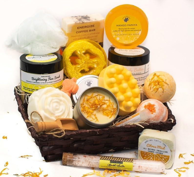 - Spa gift basket essentials: Included in the spa gift box are a scented joy wax candle, two aromatherapy bath bombs, an aromatherapy shower steamer, aromatherapy bath salts, shea butter massage soap bar, organic glycerin shaving bar in mango papaya, organic loofah soap in fresh citrus, brightening face scrub, herb infused mango & guava body butter, energizing coffee scrub soap bar, shea & cocoa butter flower soap, organic shea butter lip balm, and a shower sponge.