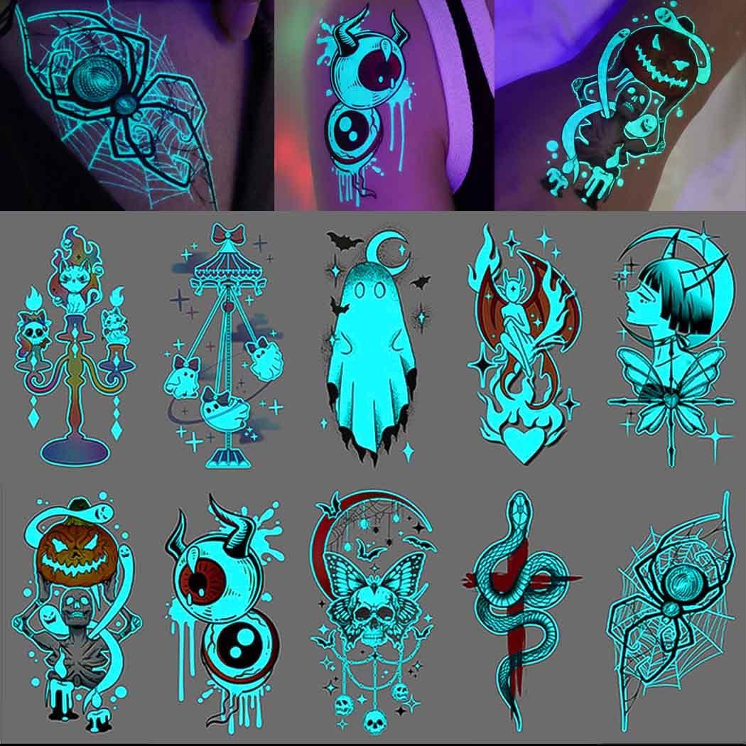 - Glow in the dark Halloween temporary tattoos cannot glow in the dark directly. Absorbing light can make it more luminous in the dark. Tip: Tattoos will glow faster when exposed to bright light