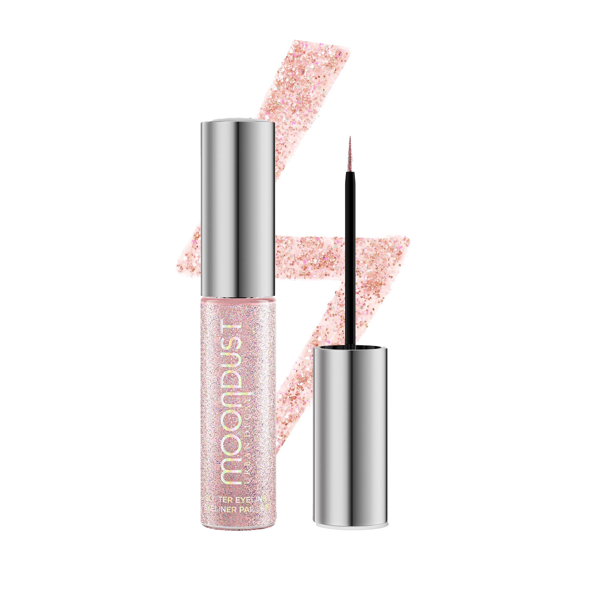 - GLITTER EYELINER Moondust Liquid Liner features superfine, multidimensional glitter in a clear, water-based formula thats buildable, dries quickly, and stays put for long wear without fallout.