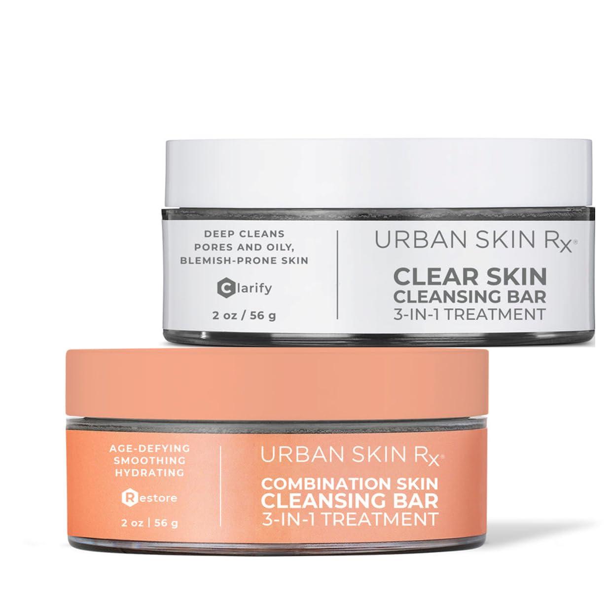 • ABOUT THE PRODUCT: The Urban Skin Rx Clear Skin & Combination Skin Cleansing Bar Duo contains complexion-perfecting & clarifying cleansers; Both products are 3-in-1 cleansers, exfoliators, and masks when left on skin 3-5 minutes prior to rinsing. Each jar contains one exfoliating sponge and one cleansing bar. Includes (1) 2.0 Oz Clear Skin Cleansing Bar & (1) 2.0 Oz Combination Skin Cleansing Bar
