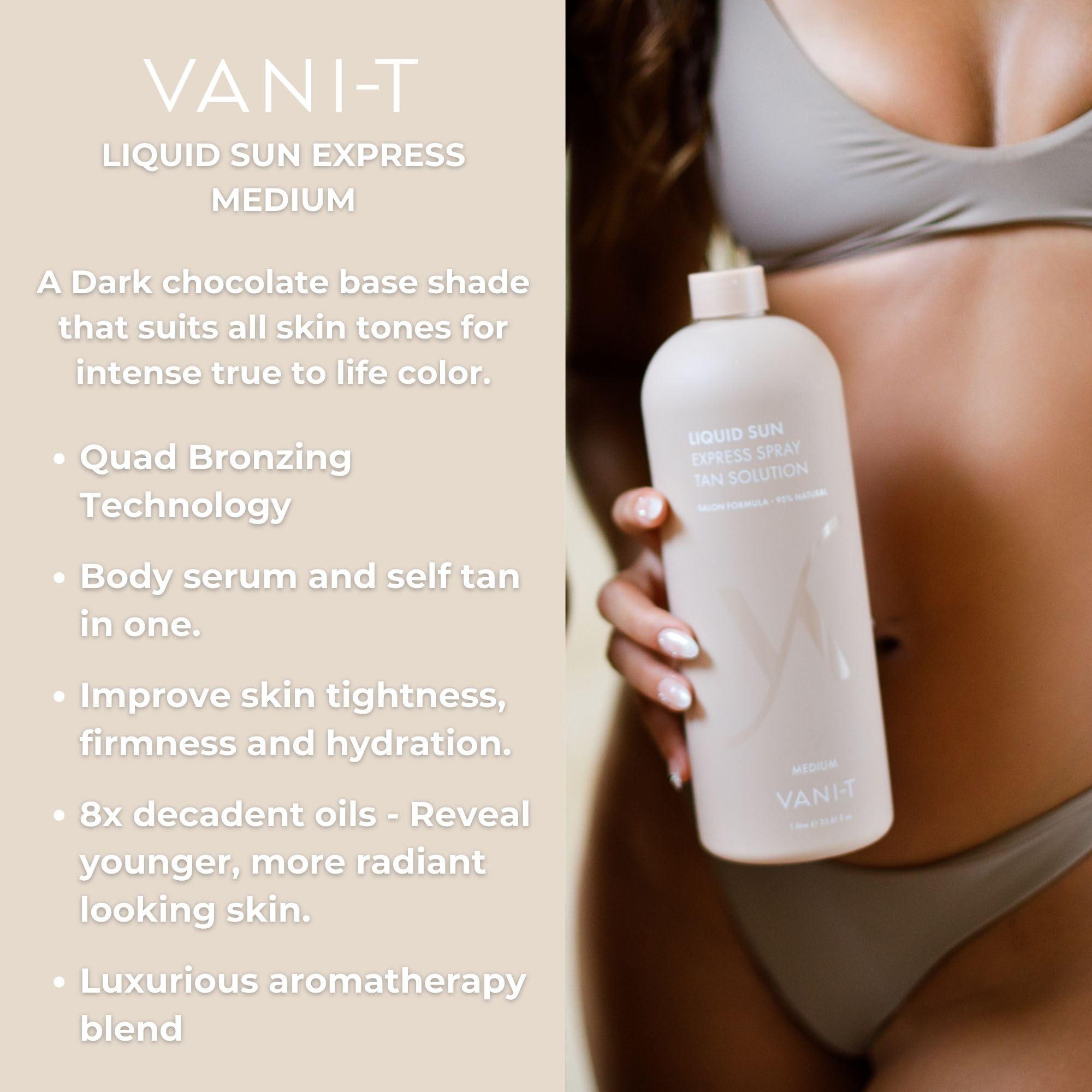 A favourite of leading celebrities, LiquidSun provides a deep, honey-dipped glow rich in anti-oxidants, botanical extracts and precious oils of argan, macadamia and coconut. DEVELOPMENT TIME: 1 HR (LIGHT), 2-4 HRS (MEDIUM), 4-6 HRS (DARK), 8 HRS (ULTRA DARK) BASE COLOUR: CHOCOLATE Ingredients 100% cruelty free and vegan 95% naturally derived Salon professional formula Made in Australia