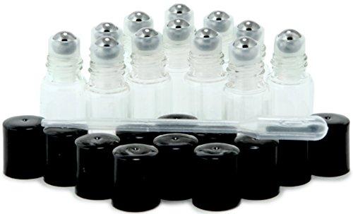 - 12, Clear Glass 3 ml Roll on bottles with stainless steel roller balls & black caps. 1 Dropper included