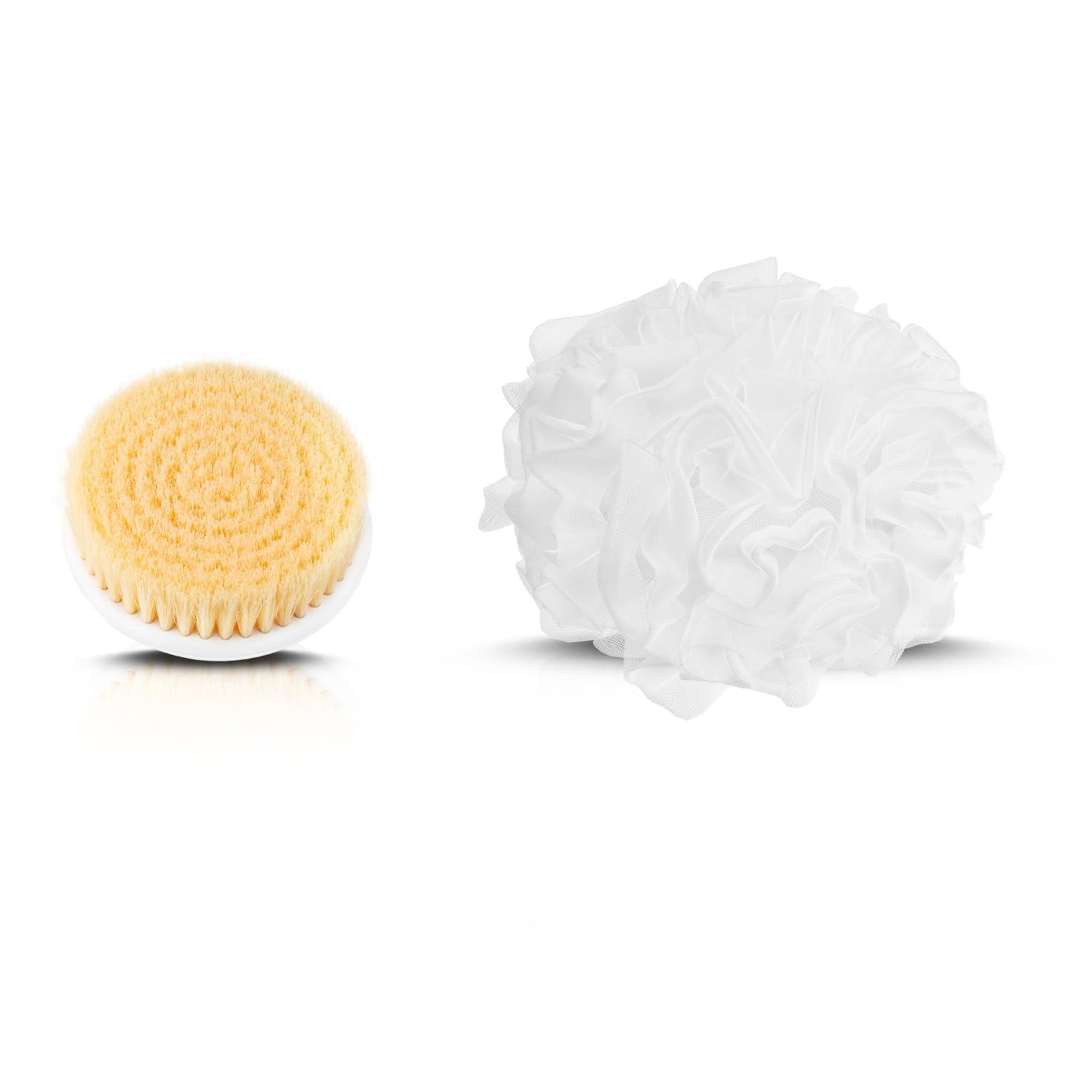 - 4 Multi-function Body Brush - with 4 attachment, soft bristle brush , a silicone bath brush, pumice stone brush,bath ball. This body scrubber can exfoliate body, oil, stains, foot exfoliation, etc. A cleansing device can meet your different body cleaning needs.