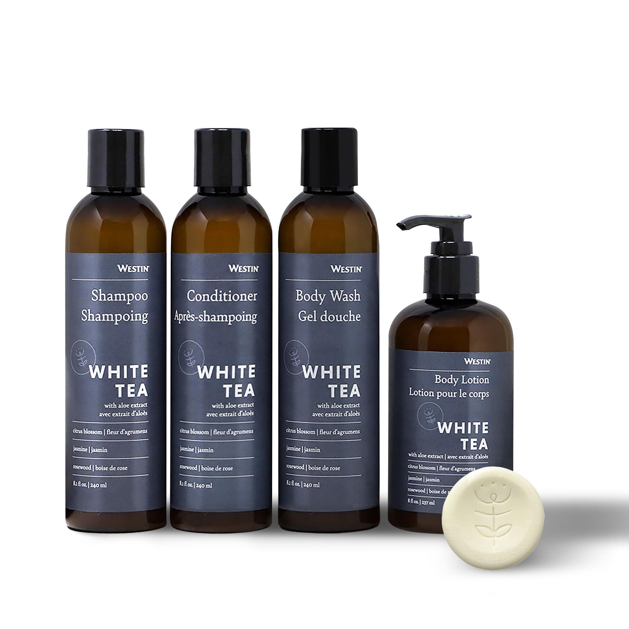 - INCLUDES - Westin White Tea Aloe Amenity Set with 8-ounce bottles of White Tea Aloe Shampoo, Conditioner, Body Wash, Body Lotion, and 5 1-ounce Leaf Soap bars. Our products are free of parabens, PABAs, dyes, and animal testing.