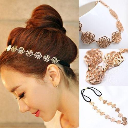 Womens Fashion Metal Chain Jewelry Hollow Rose Flower Elastic Hair Band Headband