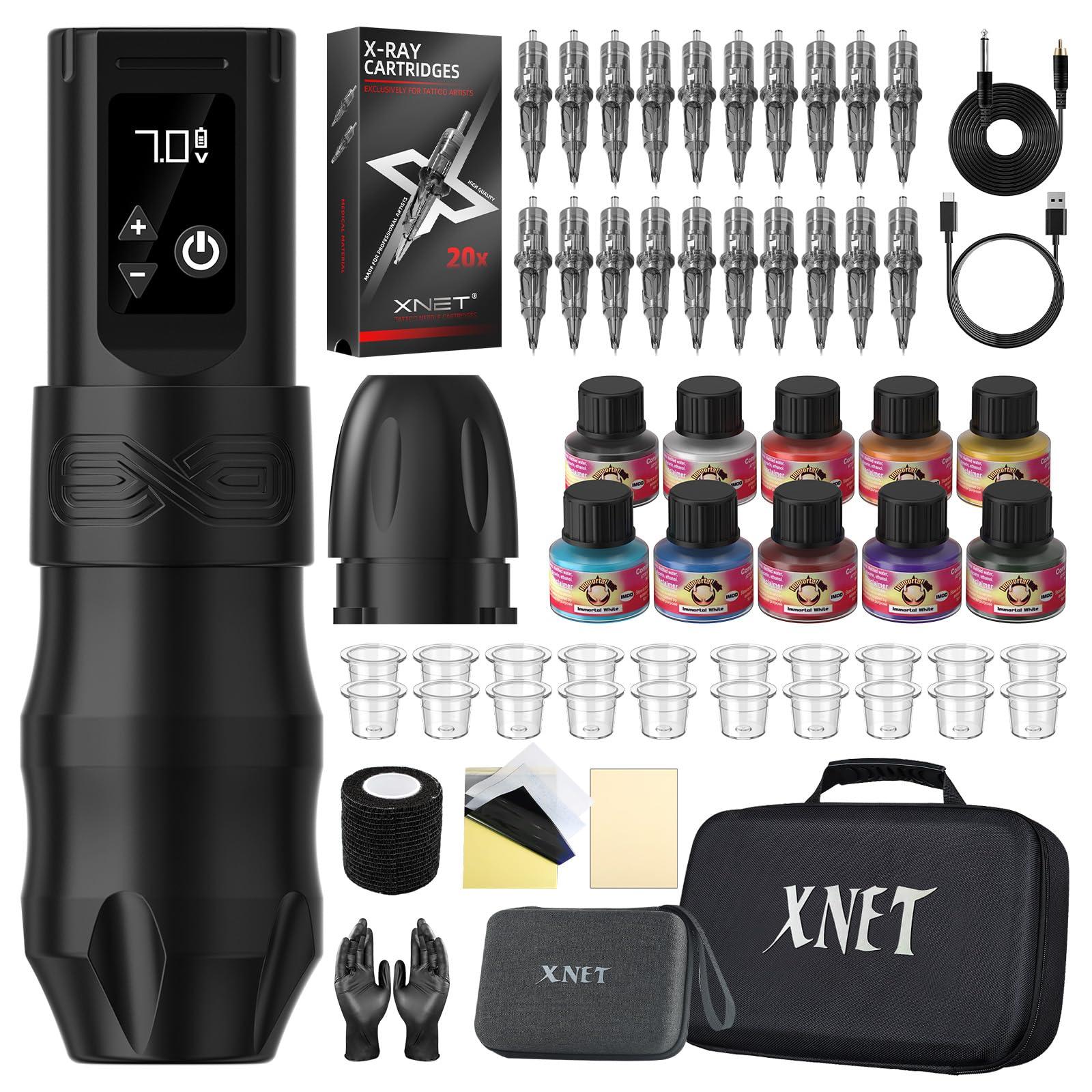 - Tattoo Kit Includes: Xnet Moteng complete tattoo kit includes 1 X wireless tattoo machine, 1 X pair of gloves, 1 X practice skin, 1 X bandage, 10 colors ink(recommended for practice use only), 1 X zipper box, 1 X RCA cable, 1 X transfer paper, 1 X USB-C charging cord, 20PCS mixed X-RAY cartridge needles (5 X 1203RL, 5 X 1207RL, 5 X 1207RM, 5 X 1209 RM). This tattoo machine kit is especially suitable for tattoo artist beginners.