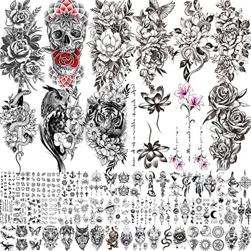 - 66 Sheets Black Flowers Temporary Tattoos For Women Designs!Every Package Includes 12 Sheets Large Floral Temporary Tattoos Sleeve For Women Girls Adults and 54 Sheets Small Temporary Tattoos For Kids Girls Boys Teens Children Dahlia Rose orchid Peony Sketch Lotus Flower Owl Tiger Snake Moon Star Butterfly Cross Mountain Dreamcatcher Dream Catcher Birds infinity Compass Universe Outer Space Tatoos Elephant Whale Dragon Wolf Tattos Lion Deer Sea Weave Sunflower Gothic Scorpion.