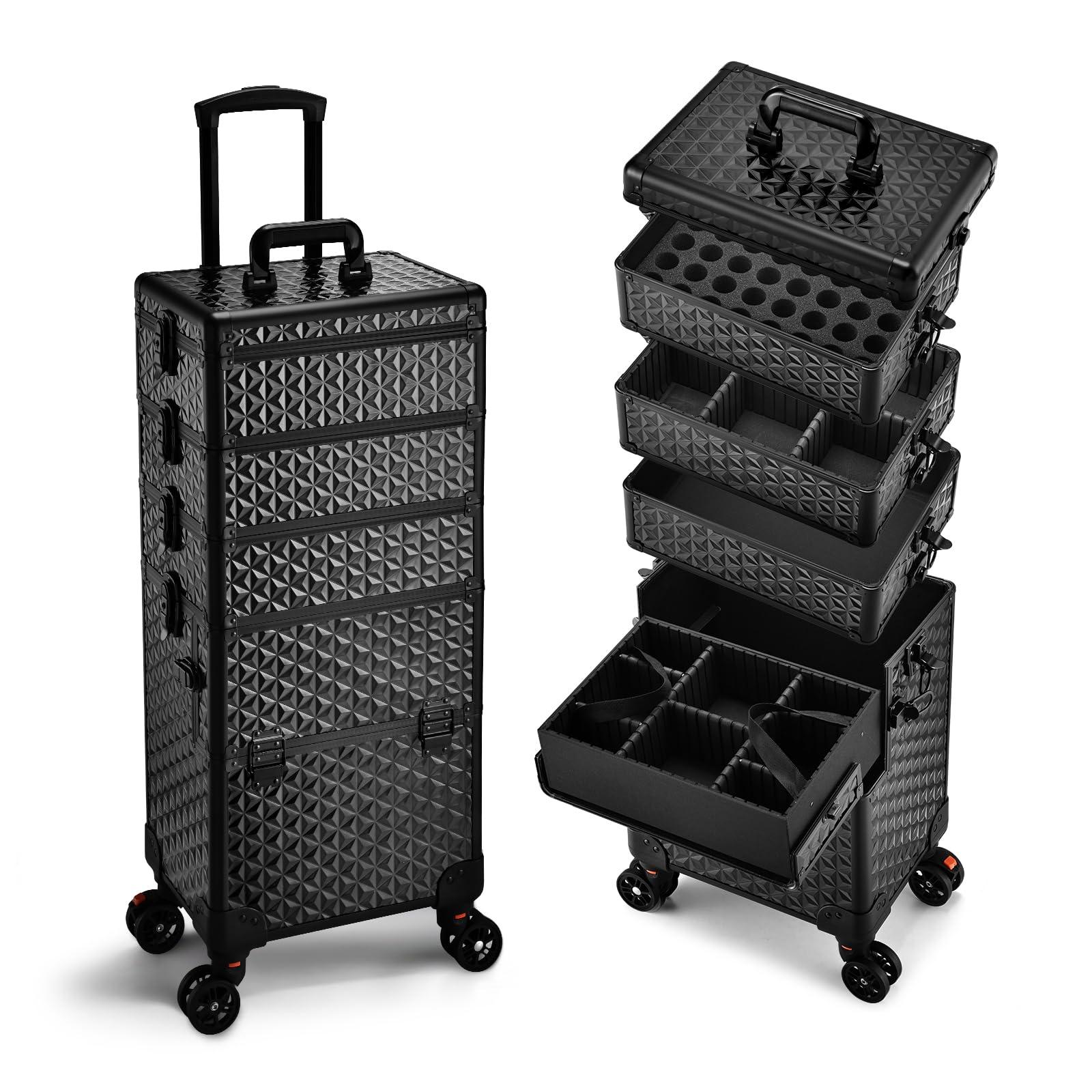 - Transformable Makeup Trolley: 5-in-1 makeup case includes 4 removable trays, with the locks on both side of the makeup cases, you can combine the makeup trunk as your requirements. It can be transformed into 4 in 1, 3 in 1 or 2 in 1 makeup case.This size of Yueieoun travel makeup case is 13 x 9.6 x 32.6 inches