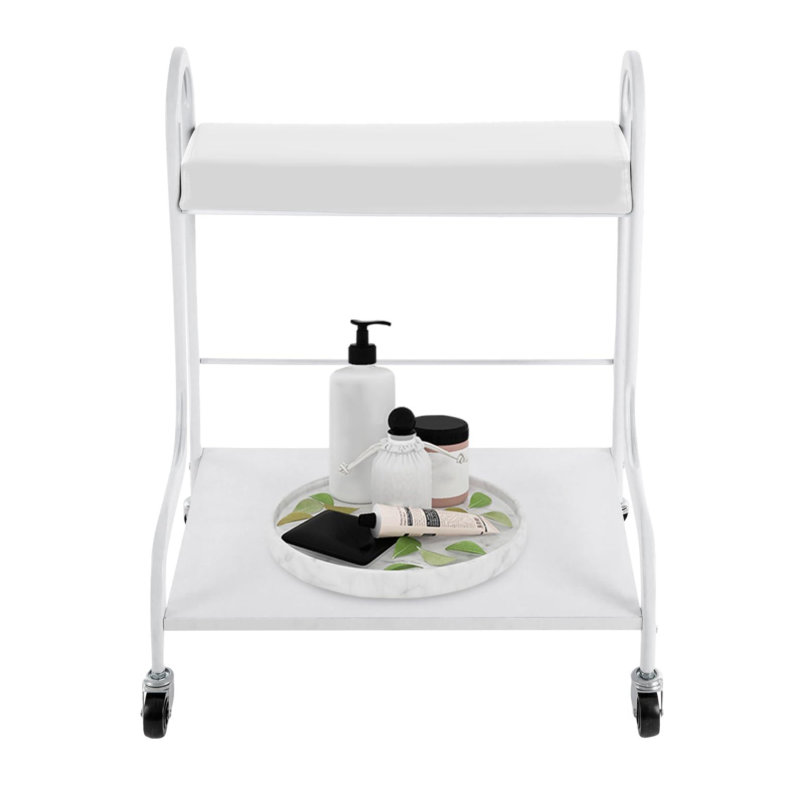 Specification Material: Metal, Wood, Sponge, PU Color: White Process: Baking Paint Indoor/Outdoor Usage: Indoor Assembly Required: Yes Mount Type: Floor Standing Caster Type: Swivel Number of Wheels: 4 Number of Tiers: 2 Number of Items: 1 Foot Pad Length: 50 cm/ 19.69 in Shelf Size: 50*37 cm/ 19.69*14.57 in Tier Spacing: 35cm/13.79in Maximum Load Capacity: About 100 kg/ 220.46 lbs Gross Weight: 6 kg/ 13.23 lbs Net Weight: 5 kg/ 11.02 lbs Package Size: 62*16*42 cm/ 24.41*6.3*16.54in Product Size: 53*37*66 cm/ 20.87*14.57* in