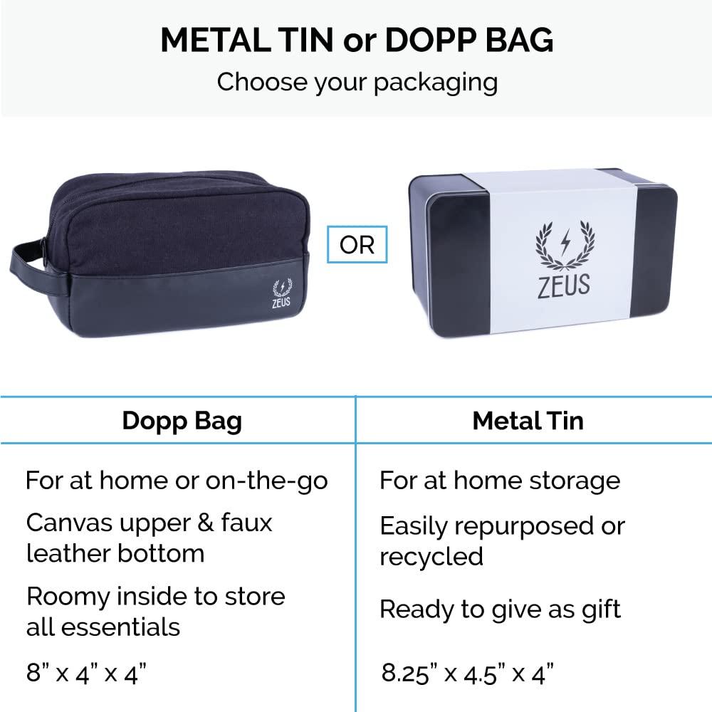 - TRAVEL DOPP BAG: Made from canvas and patent leather, the ZEUS Travel Toiletry Dopp Bag is specifically designed to hold all your grooming essentials. Measuring 8 x 4 x 4 and featuring a nylon interior allowing for easier cleaning of the bag.